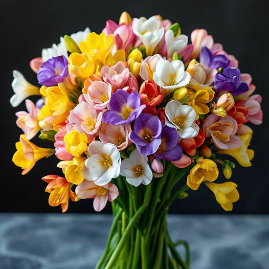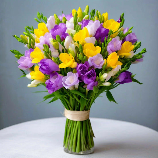 The Freesias Bouquet captivates with its subtle aroma and elegant form. Renowned for their bright hues and mild fragrance, freesias represent trust, friendship, and purity. Each stem unfolds gracefully, enhancing any event with a sense of freshness and refined charm. Perfect for birthdays, celebrations, or thoughtful gestures, this arrangement infuses every moment with the natural beauty and gentle scent of freesias.